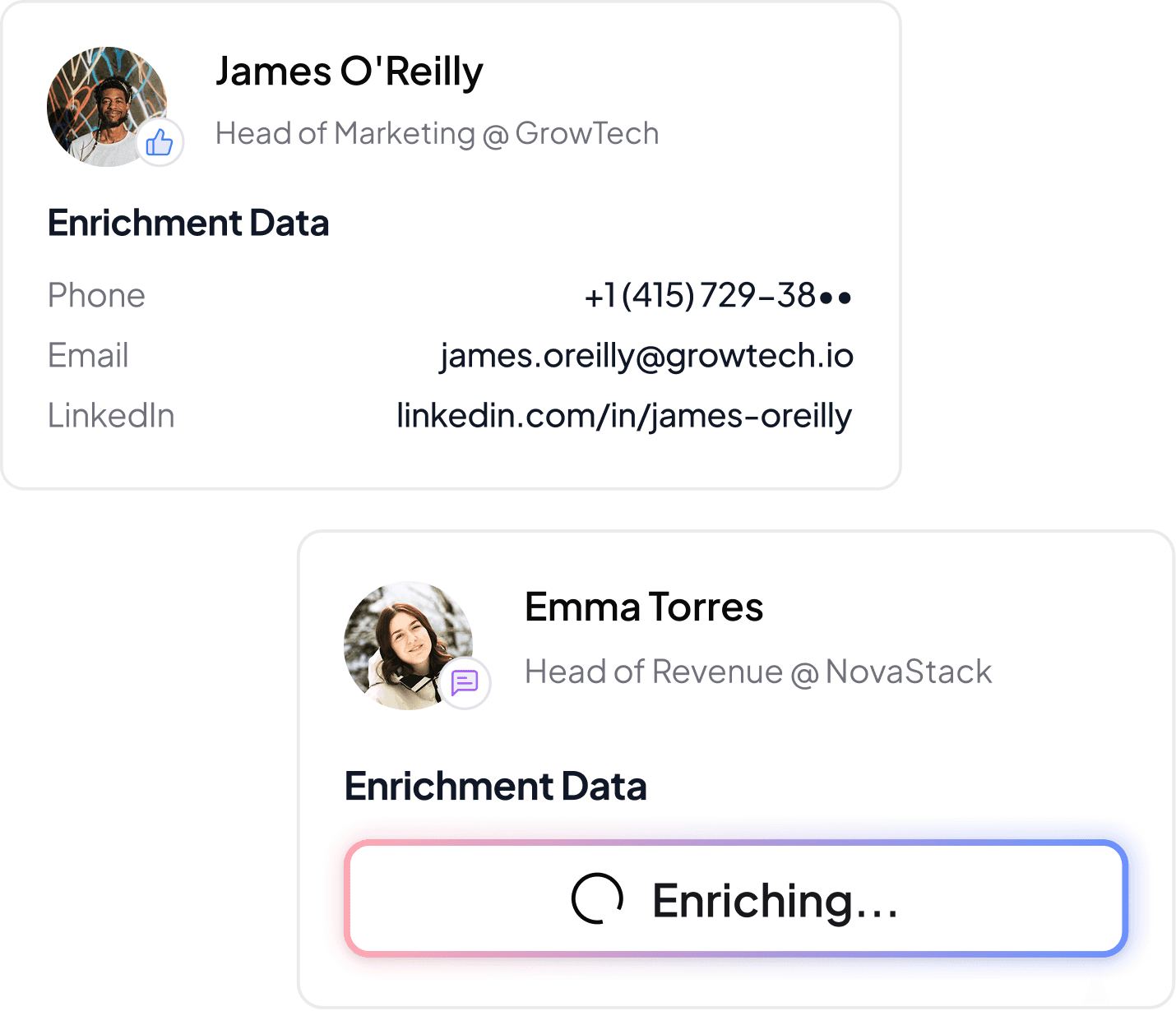 When a qualified signal appears, you can enrich the profile to retrieve contact information including phone number and email.