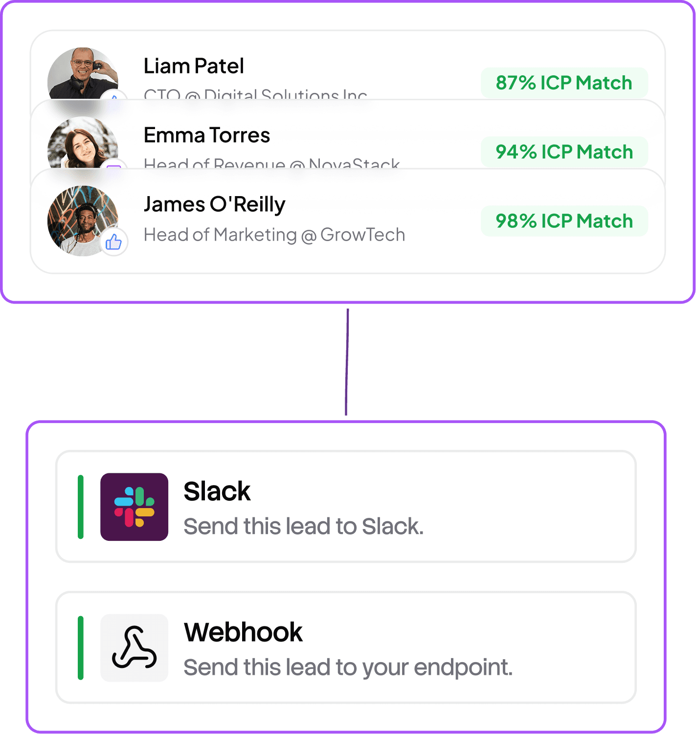 Qualified leads are sent instantly to your tools of choice (i.e. slack, webhook) so your team can act while the lead is still warm.